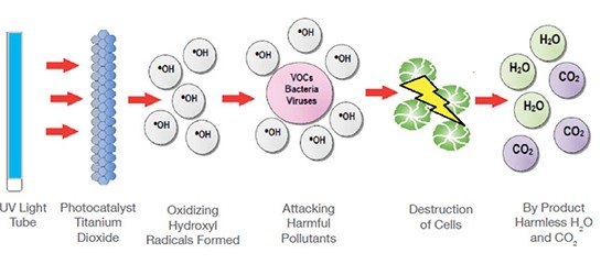 Đèn UV đặc biệt phản ứng với chất xúc tác quang được ngâm tẩm với vật liệu quý hiếm trong các đơn vị RPD và chuyển đổi hơi ẩm/ hơi nước (H2O) và oxy O2 trong không khí chưa được xử lý và phá vỡ chúng thành hydro-peroxit (H2O2) và Hydroxyl có khả năng phản ứng cao. Các gốc hydroxyl này nhỏ và linh hoạt và được đưa vào môi trường nơi chúng tấn công các phân tử ô nhiễm hữu cơ lớn hơn như nấm, mốc, vi khuẩn gây mùi, nấm mốc, VOC và vi rút, thậm chí cả những chất ở những nơi khó tiếp cận, phá vỡ liên kết hóa học của chúng và biến chúng thành những chất vô hại như carbon dioxide và nước. Nó được chứng minh là làm giảm đến 99% vi sinh vật trên bề mặt và giảm đáng kể các chất gây ô nhiễm trong không khí.