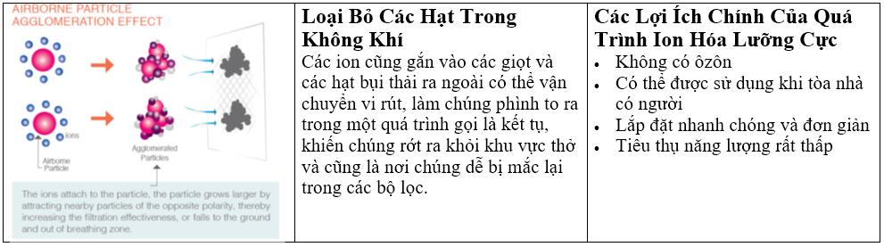 Quá trình Ion hóa Lưỡng cực (Needle-Point) giải phóng một lượng lớn các ion âm và dương. Các ion này được đẩy ra ngoài thông qua hệ thống HVAC của tòa nhà và đi vào các không gian trong toàn bộ tòa nhà. Các ion này gắn vào và vô hiệu hóa các chất độc hại như vi khuẩn, nấm mốc, chất gây dị ứng, vi rút và các hợp chất hữu cơ dễ bay hơi, mùi hôi, VOC bao gồm cả formaldehyde. Các ion tạo ra một phản ứng hóa học trên bề mặt màng tế bào làm bất hoạt mầm bệnh. Nó có thể giảm tới 95% vi khuẩn trong vài phút. Đây là một Quy trình Chủ động cung cấp khả năng khử trùng liên tục. Ion Hóa Lưỡng Cực đã được chứng minh là có hiệu quả chống lại các chủng cúm khác nhau cũng như norovirus, SAR và virus corona khác như H1N1.