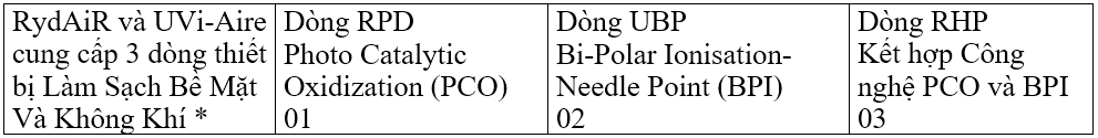 Dòng Thiết Bị Tinh Lọc Không Khí RPD thương hiệu RydAiR sử dụng công nghệ có tên là Ôxy hóa Quang Xúc tác (PCO) hoặc đôi khi được gọi là Ôxy hóa Xúc tác Bức xạ (RCI), Hydrogen peroxit khô (DHP) và Chuyển hóa Xúc tác Tự nhiên (NCC). Ban đầu, nó được phát triển vào những năm 1990 bởi các nhà khoa học tại Cơ quan Hàng không và Vũ trụ Quốc gia (NASA) ở Hoa Kỳ để xử lý không khí trong môi trường kín trong tàu vũ trụ. Công nghệ thời đại không gian này hiện đã được thương mại hóa để xử lý không khí trong nhà trong cuộc sống hàng ngày của chúng ta.
