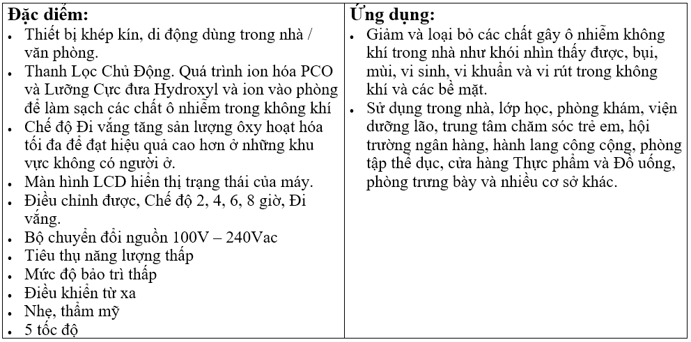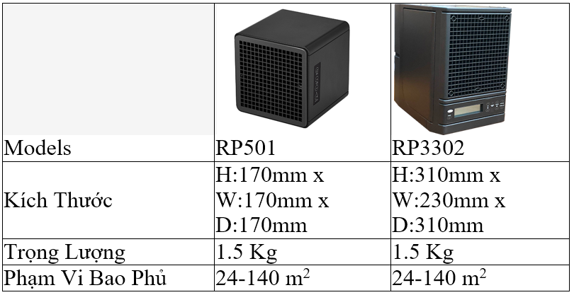 RP3302 và RP501 là các thiết bị lọc không khí di động, khép kín sử dụng nhiều công nghệ để đảm bảo không khí trong nhà sạch chất lượng cao. Đó là Quá trình Oxy Hóa Xúc Tác Quang (PCO) và Ion Hóa Lưỡng Cực (BPI).
